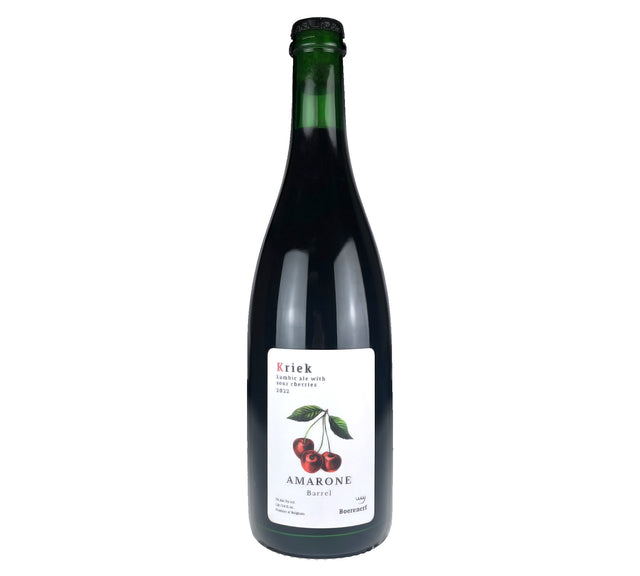 The Kriek Amarone is a blend of lambics macerated with three varieties of organically grown cherries. It is then fermented and aged in Amarone wine barrels (Boticella). After maceration the blend was further aged in a foeder.