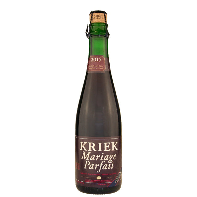 Unsweetened, unfiltered, unpasteurized, with no artificial flavors, preservatives or colorings, Kriek Mariage Parfait is made with 400 g of wild cherries per liter, fermented together with a strong Lambic of spontaneous fermentation and aged on 6,200 liter oak foeders (large wooden casks) for 6 to 8 months. After 6 months in the bottle, where it referments, it's ready for tasting.