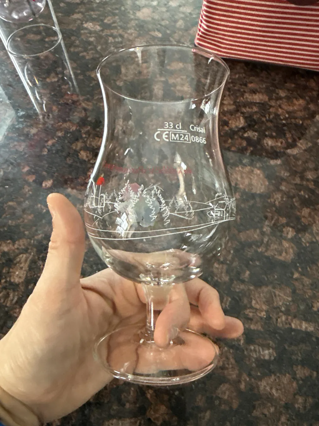 Approximately 6-3/4" H x 3-1/2" in diameter, glass has a classic tulip bowl on a short stem. 33 cl/11.2 oz capacity.