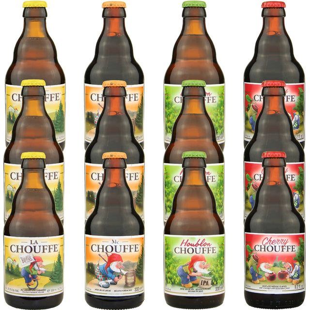 The Chouffe Sampler includes 12 bottles of fine Belgian ale from Brasserie D'Achouffe (D'Achouffe Brewery): three 11.2 oz bottles each of La Chouffe, McChouffe, Houblon Chouffe, and Cherry Chouffe.