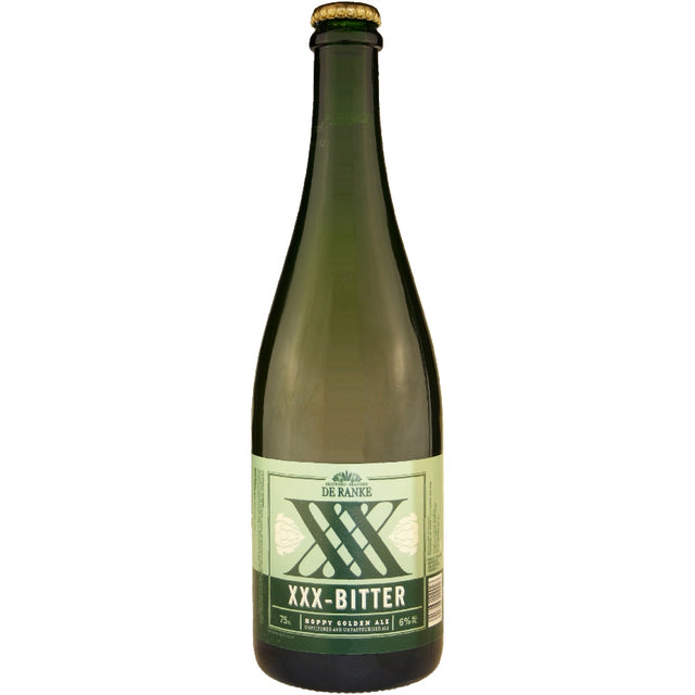 De Ranke XXX Bitter is a Belgian Golden Ale with IPA style---and even more hop flavor than its brother brew, XX Bitter. It pours light, hazy gold with a billowy, off-white head and great retention.