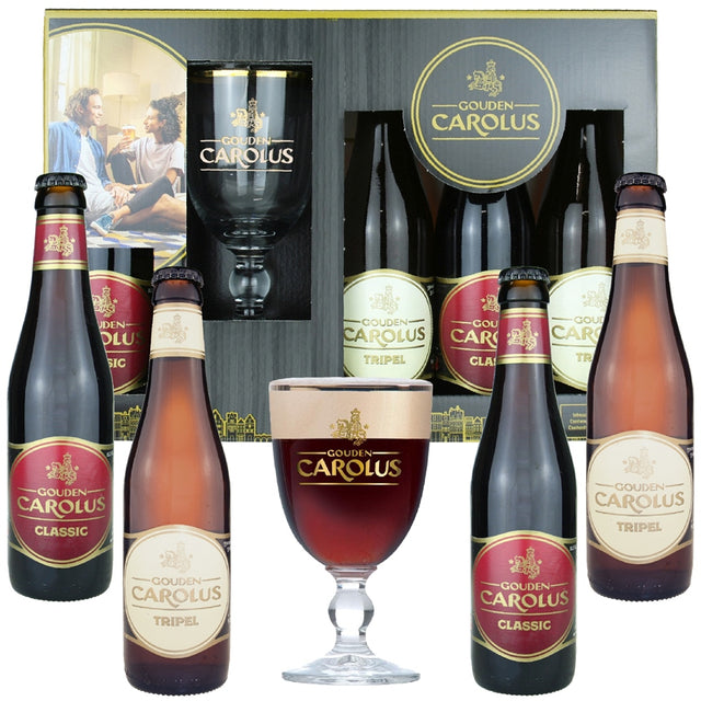Gouden Carolus Gift Set includes four 11.2 oz bottles: two each of Gouden Carolus Tripel and Gouden Carolus Classic, plus a genuine Gouden Carolus glass.