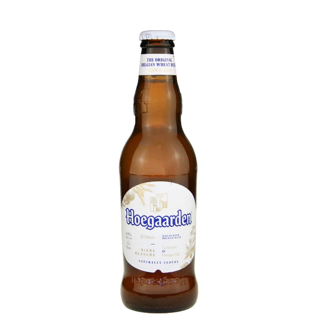Hoegaarden White (ABV 4.9%) from Brouwerij Hoegaarden (InBev) is a refreshing, unfiltered wheat beer (witbier) with a cloudy, pale gold appearance and a lasting white head.